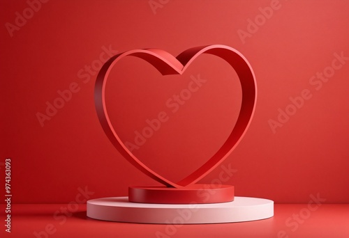 Red product display podium on red background, heart shape ribbon bending around podium. Valentines day modern minimalistic mockup, podium display for product presentation. Ai generated image
