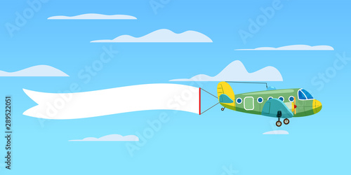 Red retro biplane aircraft pulling advertisement banner