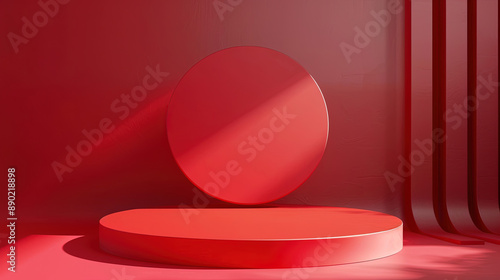 Red round podium on red background. Modern podium for product presentation. Red podium background. Copy space area for text.