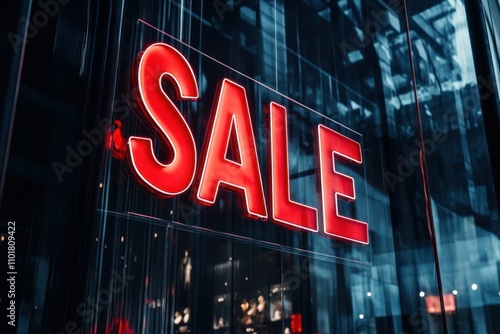 red signboard with text SALE UP TO 90% OFF in front of the showcase of fashion store, black friday concept