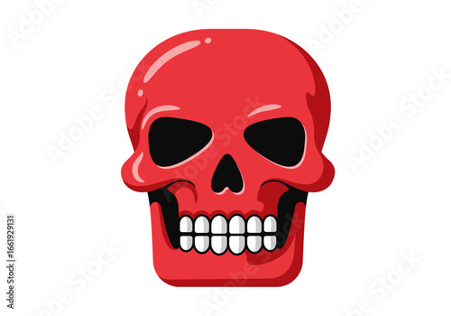 Red skull with black eye sockets and nose hole showing white teeth on a white background