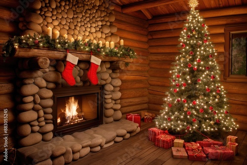 Red socks or stockings hanging under over the Christmas decorated fireplace mantle in the house. Generative Ai