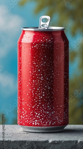 Red soda can with white speckled pattern placed on concrete ledge with sunset sky background