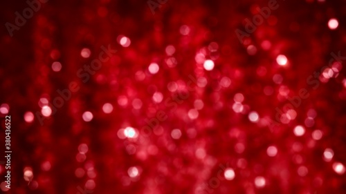 Red sparkle glitter tinsel with bokeh effect and selective focus. Festive background with bright gold raining lights. Abstract 3D illustration Christmas and New Year's Eve concept texture template.