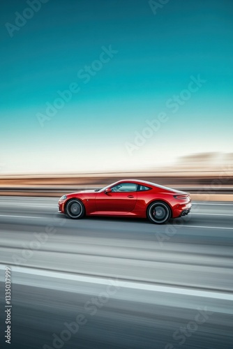 Red sports car speeding on open highway with motion blur in clear blue sky.
