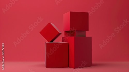Red stacked cubes 3d rendering image. Abstract minimalist design. Blocks against solid red background wallpaper art colorful realistic. Abstraction concept idea, conceptual photo