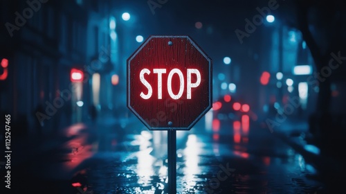 Red Stop Sign at Night with Bold Letters and Clear Visibility in a Urban Environment