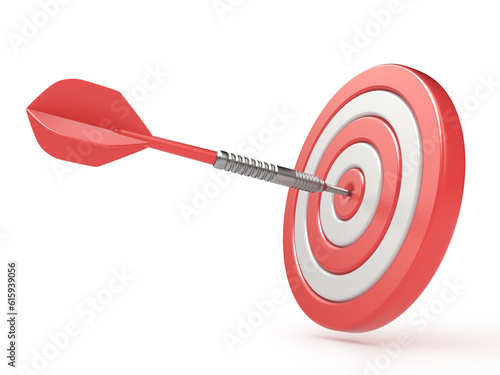 Red target and dart hitting center. 3D render illustration isolated on white background
