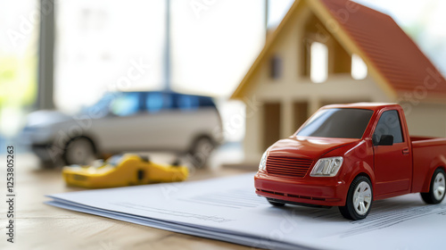 red toy truck in focus with house model and paperwork in background, symbolizing real estate and vehicle transactions