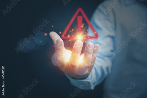Red triangle caution warning signs on the hand of businessman for risk assessment of maintenance.