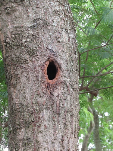 Red tufted woodpecker nest. Hollow in the tree made by a woodpecker to make its nest