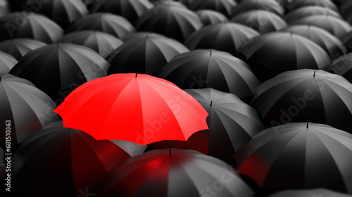 Red umbrella among many black ones. Metaphor individuality. Concept unique personality. Background for ads individuality or leadership. Backdrop for advertising. Background with umbrellas. 3d image