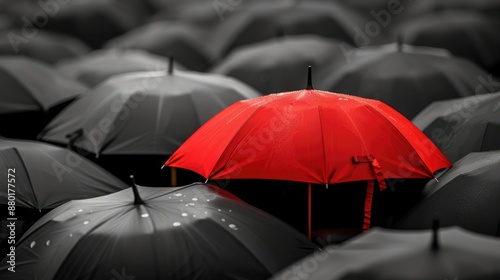 Red umbrella stand out from the crowd of many black and white umbrellas. Business, leader concept, being different concepts