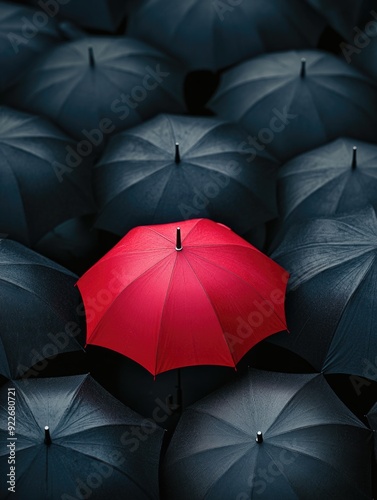 Red umbrella stands alone amidst a group of black ones, symbolizing loneliness or isolation.