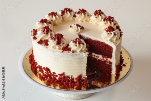 Red velvet cake with a slice cut out, showing the delicious cream cheese frosting and red crumbs