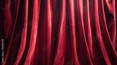 Red velvet curtains parting on a theater stage, ready to reveal the performance, evoking drama and anticipation.