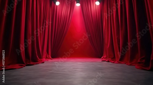 Red velvet theater curtains part under bright stage lights, creating a dramatic ambiance, AI