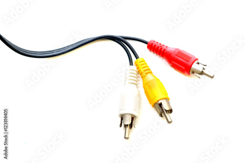 Red, white and yellow male cinch plugs, isolated on white background