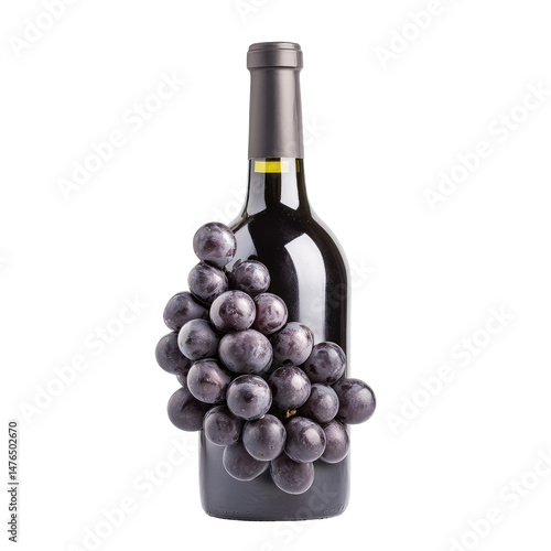 Red wine bottle adorned with ripe dark grapes
