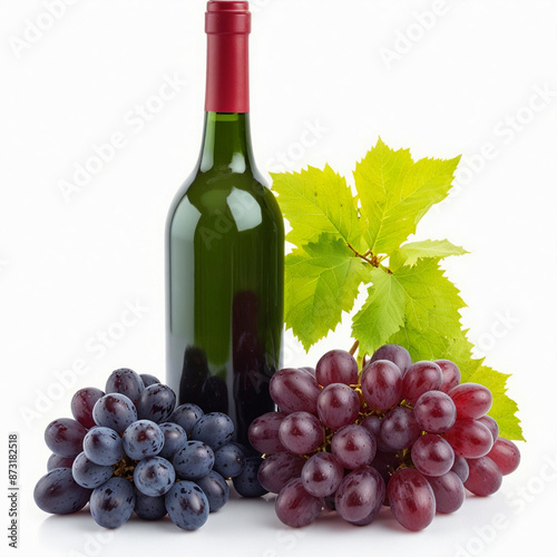 Red wine bottle and bunches of grapes,isolated on white background