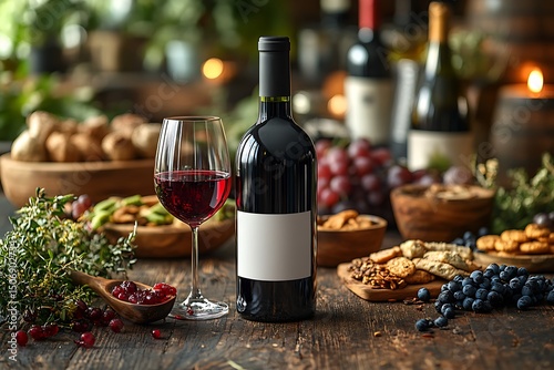 Red wine bottle mockup with glass and rustic table snacks