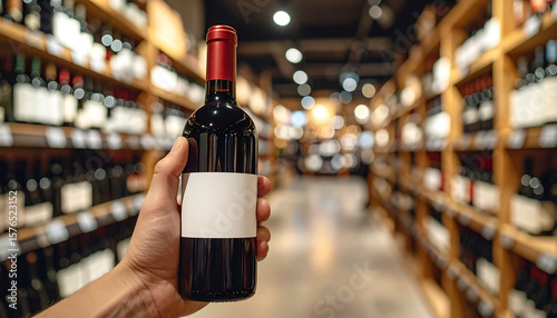 Red Wine Bottle with Blank Label Held by Hand in Liquor Store Aisle, AI-generated