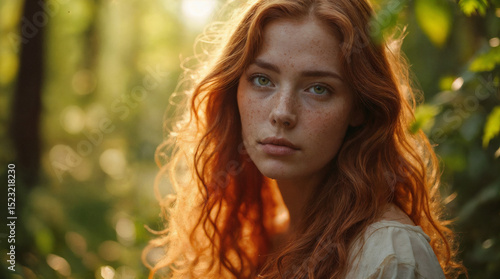 Red-haired woman in soft natural light surrounded by forest foliage, cinematic portrait style