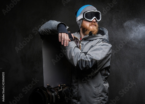 Redhead bearded man wearing a full equipment for extreme snowboarding leaning on a snowboard and looking away, isolated on a dark textured background.