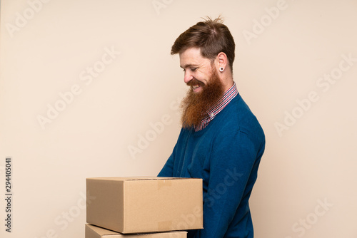 Redhead man with long beard over isolated background holding a box to move it to another site
