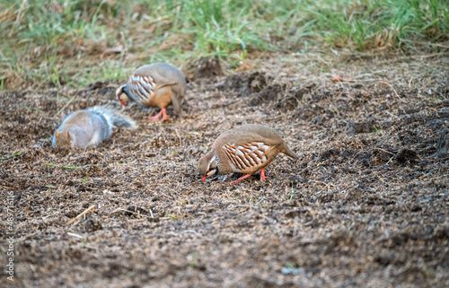 red-legged partridge (Alectoris rufa) birds ground feeding alongside grey squirrels (Sciurus carolinensis)