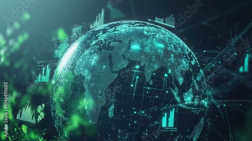 Reduce CO2 emissions visualization featuring a globe with green technology symbols and emission reduction charts, ideal for a global stock image