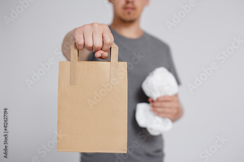 reduce, reuse and recycle concept - plastic bag and brown recyclable eco paper bag in male hands over grey background