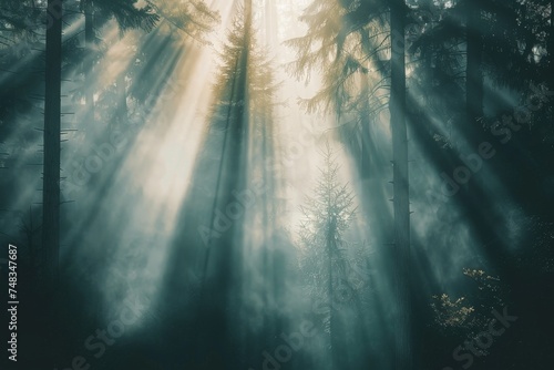 Redwood Forest in Sunlight, Green Pine Trees in Sunlight Rays Falling, Copy Space