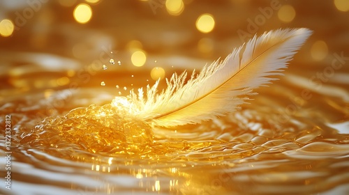 Refined feather quill hovering above a golden ink puddle in a delicate scene
