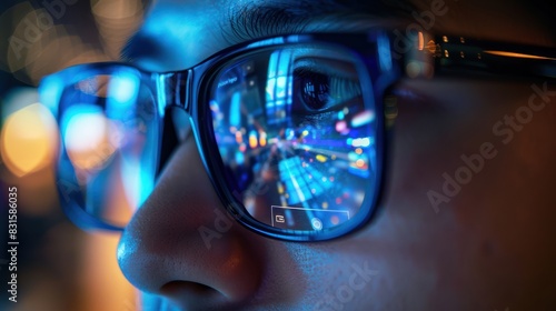 Reflected in the glasses of a businessperson. The office environment is visible in the background.