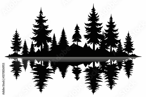 reflection in water pine tree forest silhouette line art vector illustration