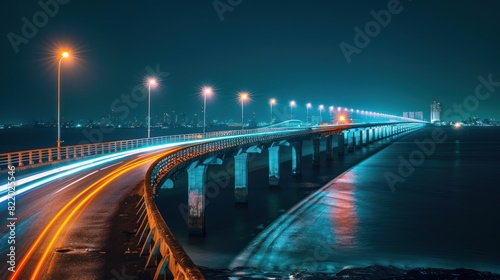 Reflection of bright lanterns in the Dnieper river under the bridge