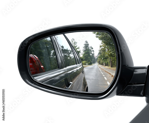 Reflections of a scenic drive in side mirror serene road nature tranquil environment isolated on transparent background, png