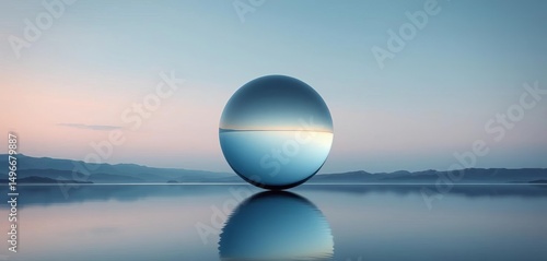 Reflective sphere on still water, minimalist landscape, panoramic view, abstract, mysterious