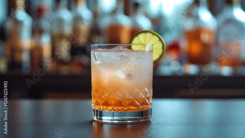 Refreshing alcoholic cocktail in a stylish glass with lime slice on a wooden bar countertop against a blurred background.