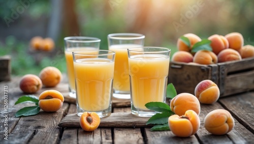 Refreshing apricot juice in glasses on a rustic wooden table surrounded by fresh apricots and greenery, perfect for summer promotions.
