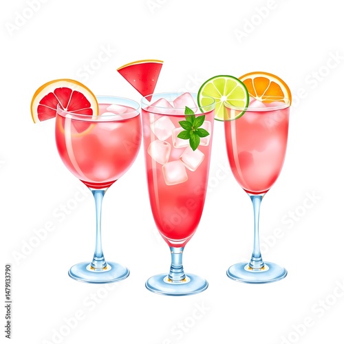 Refreshing assorted fruit cocktail beverages with ice and garnish in elegant glassware