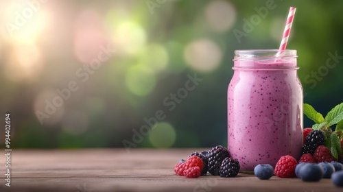 Refreshing berry smoothie in a jar with natural background and sunlight during summer