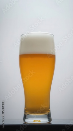 Refreshing Beverage: A tall glass filled with a foamy, golden liquid against a clean, simple backdrop.