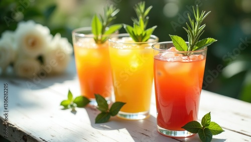 Refreshing beverage, Tasty vegetable juices and fresh components on a light grey surface, Close-Up of Three Cups of Fruit Juices on a White Garden Table. Elevated Perspective.