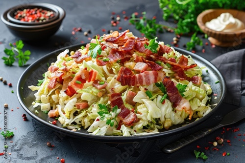 refreshing cabbage salad with crispy bacon and creamy mustard mayo dressing served in a rustic bowl with parsley and green onion