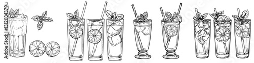 Refreshing cocktail drinks with mint and citrus in various glass styles showcased on a white background