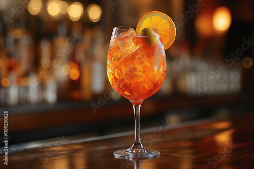 Refreshing cocktail served in a stylish glass at a vibrant bar in the evening. Generative AI