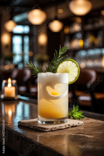 Refreshing Cocktail with Lime and Rosemary Garnished on a Wooden Bar