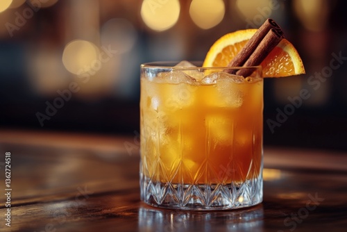 Refreshing cocktail with orange slice and cinnamon stick served in elegant glass on wooden table in cozy bar ambiance
